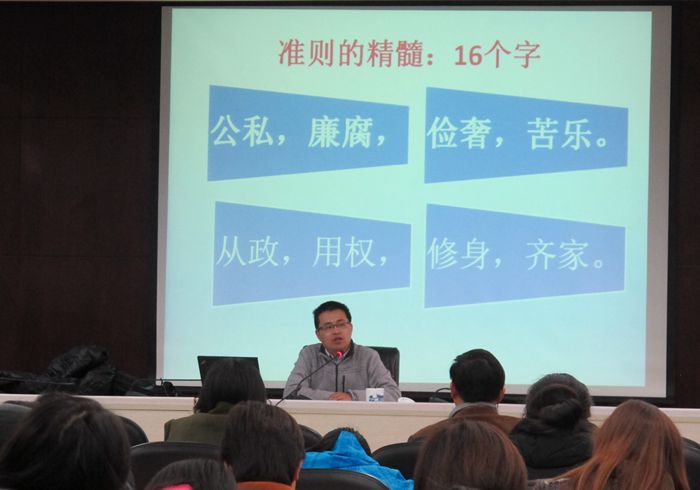袁教授精心准备了大量资料和案例,围绕“从严执记、正本清源”这一主题,从《中国共产党廉洁自律准则》和《中国共产党纪律处分条例》出台的意义展开,重点论述了《中国共产党廉洁自律准则》的背景和《中国共产党纪律处分条例》的亮点,分析了新旧版本准则、条例的差异。他在报告中指出,准则和条例把党的十八大以来从严治党实践成果转化为道德和纪律要求,是管党治党制度创新的重要成果,实现了党内法规建设的与时俱进,是在我党长期执政和全面依法治国条件下依规管党治党、加强党内监督的重大举措,是全面从严治党的治本之策。他强调,准则和条例一正一反配合、自律他律结合;准则是“高线”,贯彻落实准则要求,就是要求党员“仰望高线”,把思想道德挺在纪律前面;条例是“底线”,遵守条例规定,就是要求党员“守住底线”,把党纪挺在法律前面。在两个小时的时间里,袁教授通过一件件鲜活的违纪案例,深入浅出、形象生动得解读了条例中的有关规定,令在座的党员干部颇深领悟、记忆深刻。