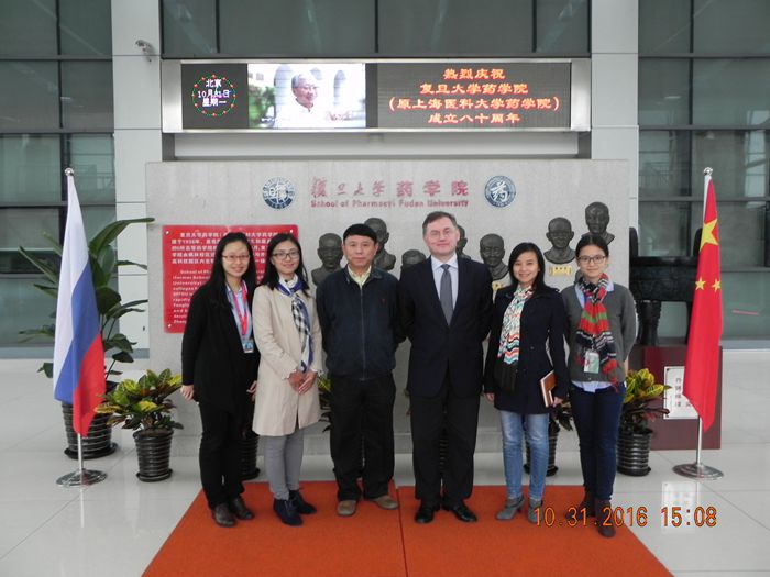 Accompanied by Dr. Yueming Xu (Functional Platform Director of iHuman Institute, ShanghaiTech University), Professor Raul Gainetdinov from Institute of Translational Biomedicine, Saint-Petersburg State University of Russia visited School of Pharmacy, Fudan University in the afternoon of October 31, 2016. He was warmly greeted by Professor Ming-Wei Wang (Dean) and Associate Professor Yan Li (Assistant Dean), among others. Dr. Wang discussed the intent of forging academic exchanges with Professor Gainetdinov and invited him to participate in 2017 Queenstown Molecular Biology Meetings in Shanghai.