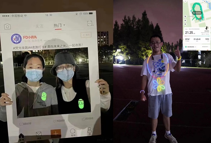 10月5日,骤降的气温阻挡不了药学院跑步爱好者们的热情。晚上七点,约三十位同学在张江操场共同参加了“奔向未来之光”荧光夜跑活动。参与者们佩戴荧光手环,身贴荧光贴纸,成为在黑暗中不断聚集、流转的荧光。他们把轻盈的脚步与多彩的荧光结合,闪耀了张江的天空,点亮了夜色,也一同奔向未来。跑步活动持续两个多小时,大家在跑步中收获了乐趣与健康,更有同学坚持跑完全程,完成了一个半马、21公里的目标。凉爽的月夜下,轻松的假期中,大家共同享受了对突破极限的渴望以及生生不息的追求。